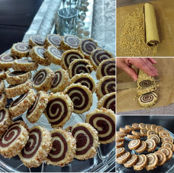 Svetlo testo premazati lagano umućenim belanjkom, na njega staviti tamno, pa lagano urolati testo da se drži zajedno.