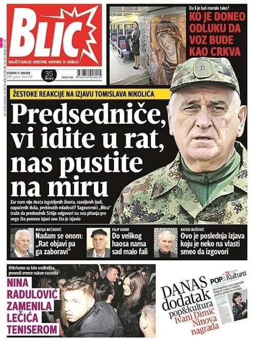 Drugi dan zaredom, beogradski dnevni list Blic objavljuje anti-ratni poruke i protivljenje ratnohuškačkom vokabularu predsjednika Srbije Tomislava Nikolića, piše lajmi.net.