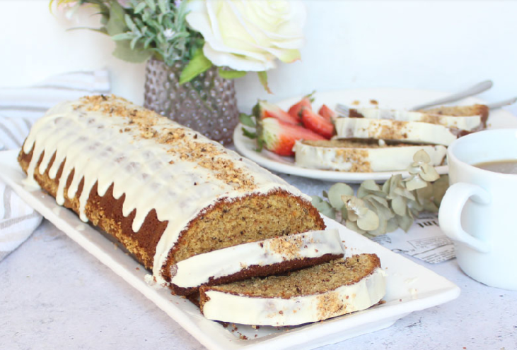 Pečeni kolač ostavite 5 minuta u kalupu, zatim ga pažljivo izvadite i ostavite da se ohladi na sobnoj temperaturi. Ohlađeni kolač prelijte otopljenom bijelom čokoladm i posipajte s malo sjeckanih lješnjaka.