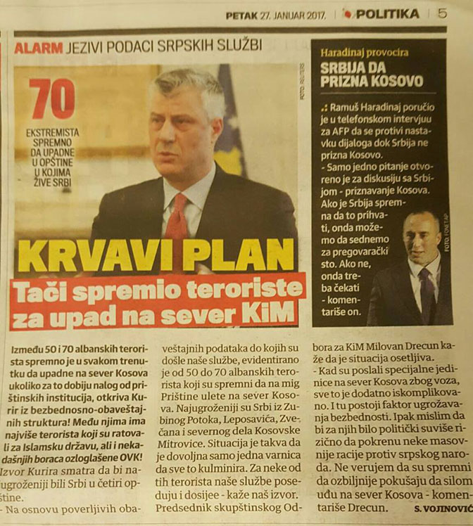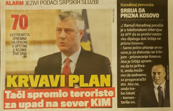 Predsjednik Kosova Hashim Thaçi je pripremio krvavi plan preko kojeg će albanski “teroristi” ući na djever Kosova, pišu današnji dnevni listovi u Srbiji.