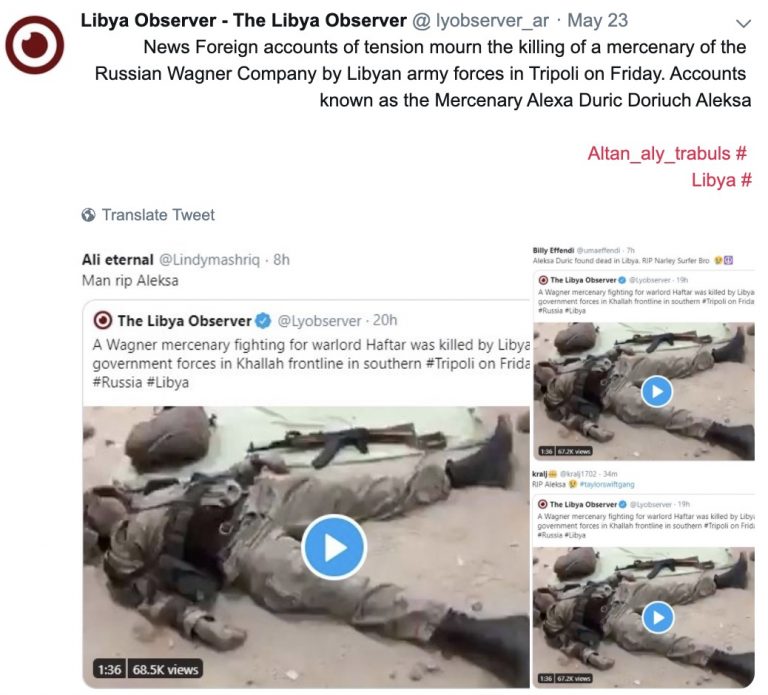 Prije nekoliko dana snage koje podržavaju Vladu nacionalnog jedinstva Libije objavile su snimak ubijenog pripadnika ruske plaćeničke grupe Wagner. Vlada nacionalnog jedinstva Libije još uvijek nije saopćila podatke o identitetu ubijenog stranog plaćenika, međutim na društvenim mrežama objavljena je informacija sa se radi o srpskom plaćeniku sa Kosova Aleksi Duriću. Ovu informaciju objavili su i pojedini ruski portali koji prate dešavanja oko plaćeničke grupe Wagner.
