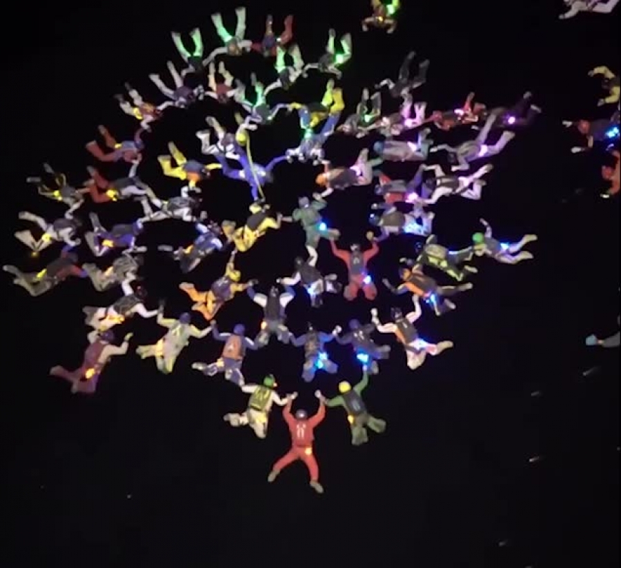 64 profesionalnih padobranaca udružilo se da bi oborili rekord i postali najmnogobrojnija grupa koja je ikad učestvovala u noćnom skakanju s padobranom.