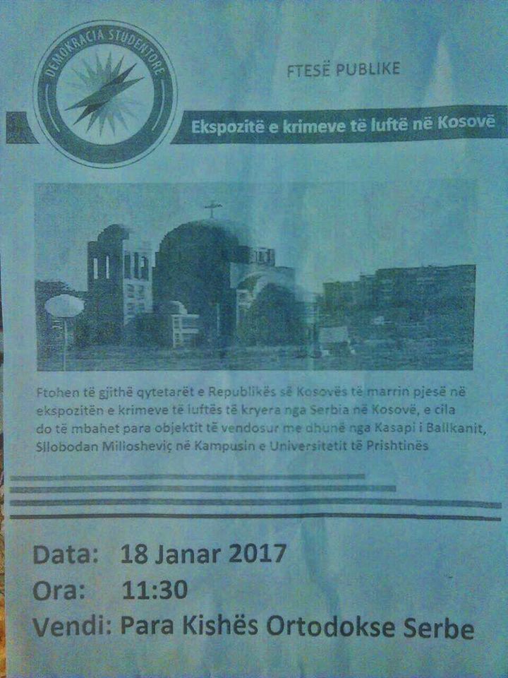 “Pozivamo sve građane Republike Kosovo da učestvuju na izložbi zločina rata koji je Srbija vodila na Kosovu, a koji će se održati ispred objekta koji je građen odlukom kasapina Balkana Slobodana Miloševića,” navodi se na letku koji se mogao naći na ulicama Prištine.