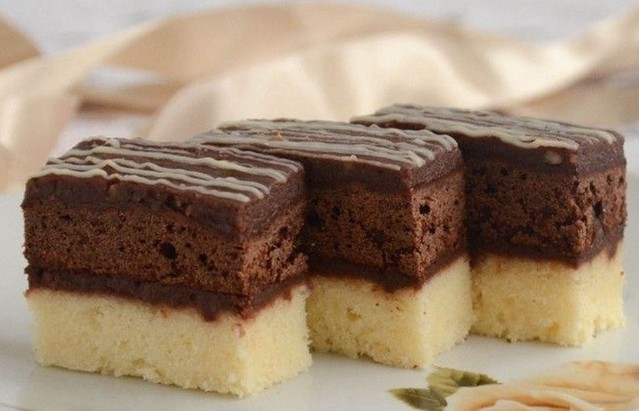 Svijetli i tamni biskvit posebno ispecite (25 × 35 cm tepsija, 180 °C, oko 20 minuta). Ohladite.