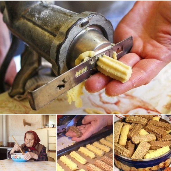 Na masinu za mljevenje mesa stavite nastavak za profilisanje keksa,masinom za mljevenje mesa tijesto se potiskuje kroz zeljeni profil.