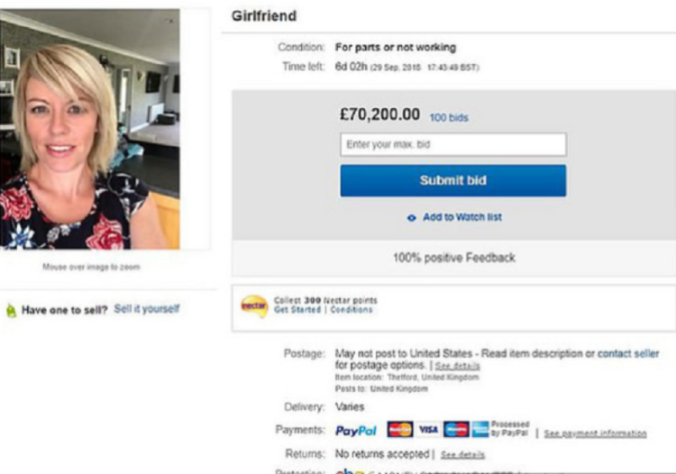Nešto što je počelo kao nevina šala brzo se pretvorio u međunarodnu, virtuelnu aukciju. Dejli Liks iz Londona odlučio je da se osveti svojoj djevojci za šalu. Stoga je postavio oglas na “iBej” u kojem je naveo da prodaje svoju djevojku Keli Grivs.