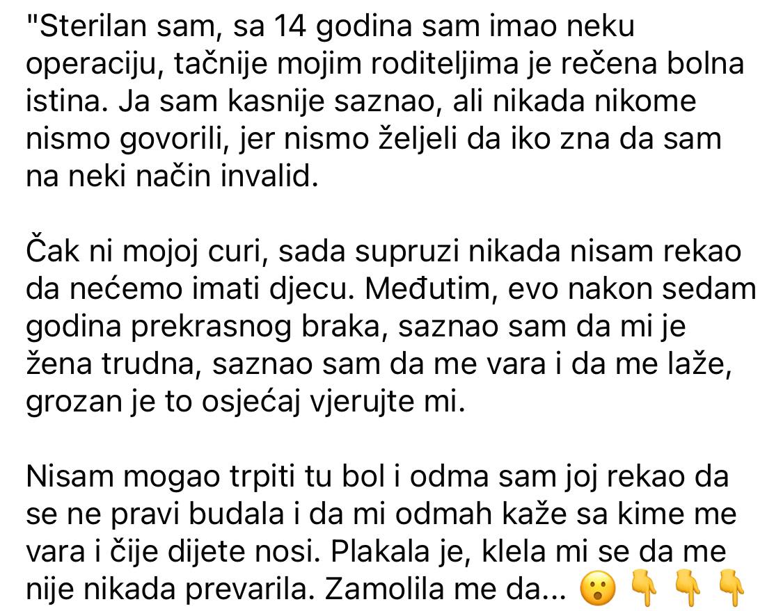 Čak ni mojoj curi, sada supruzi nikada nisam rekao da nećemo imati djecu. Međutim, evo nakon sedam godina prekrasnog braka, saznao sam da mi je žena trudna, saznao sam da me vara i da me laže, grozan je to osjećaj vjerujte mi.