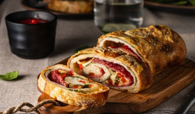 Pomešajte rastopljeni puter s iseckanim belim lukom i premažite testo. Pospite naseckanim peršunom. Složite šunku u dva reda po sredini testa, ostavljajući oko 5 cm razmaka između šunke i ivica testa. Na šunku složite salamu i sir, te ponavljajte postupak dok ne potrošite namirnice.