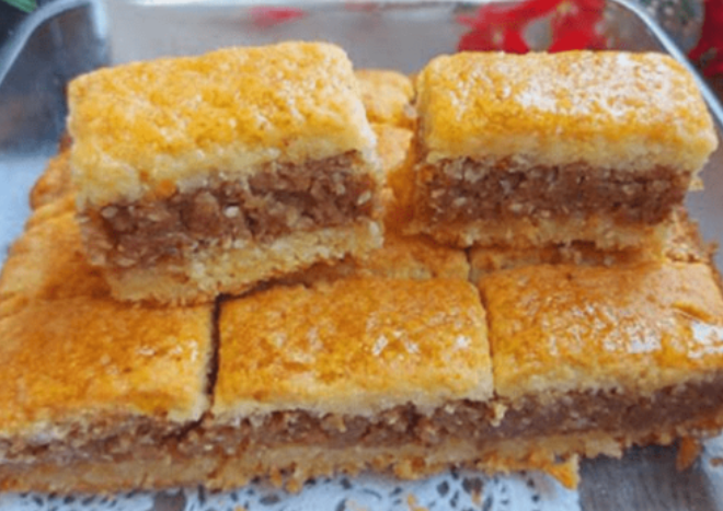 Na foliju razvući veličinu pleha. Preko donjeg dela u plehu staviti razvijen nadev od oraha, a preko oraha drugi deo razvijenog testa. Iseći nožem na kocke i peći na 190 stepeni 45-50 min.