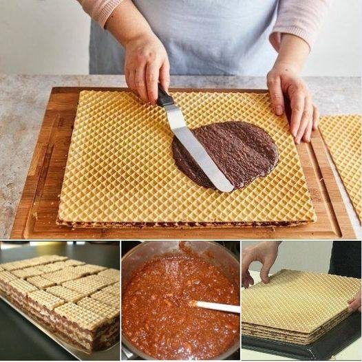 Površinu pritiskati rukama kako bi se oblatne spojile. Omotati alufolijom, opteretiti nečim površinu oblatni i dobro rashladiti.