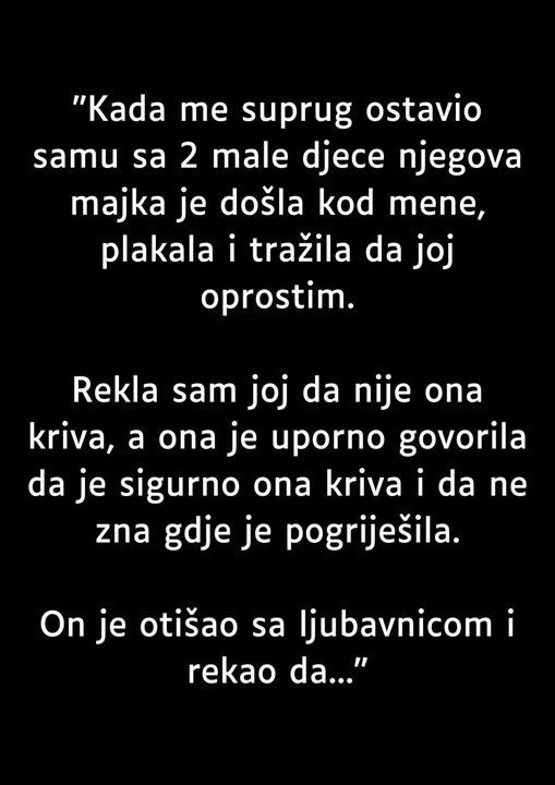 “Kada me suprug ostavio samu sa 2 male djece njegova majka je došla kod mene, plakala i tražila da joj oprostim.