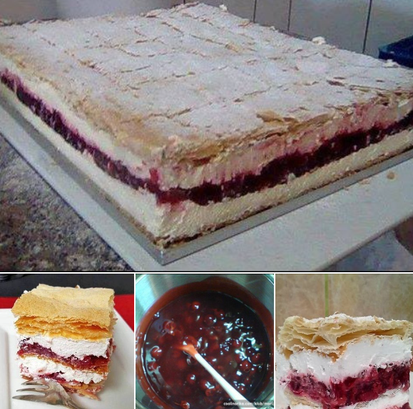 Izlupati slatko vrhnje i slagati ovim redoslijedom: kora-fil od višanja-slatko vrhnje-kora-fil od višanja-slatko vrhnje-kora.