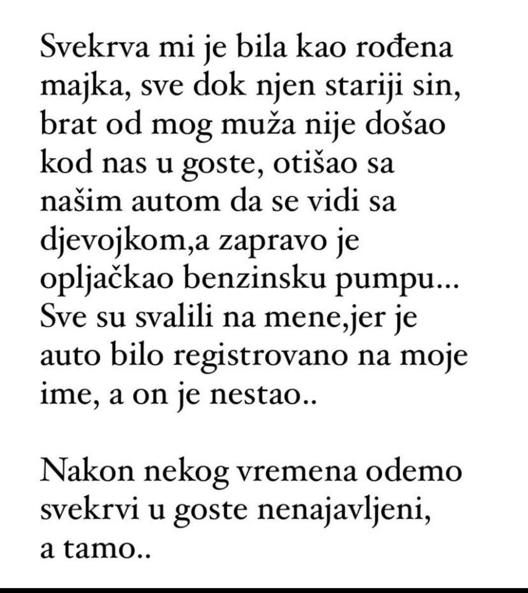Svekrva mi je bila kao rođena majka, sve dok njen stariji sin, brat od mog muža nije došao kod nas u goste, otišao sa našim autom da se vidi sa djevojkom,a zapravo je opljačkao benzinsku pumpu…