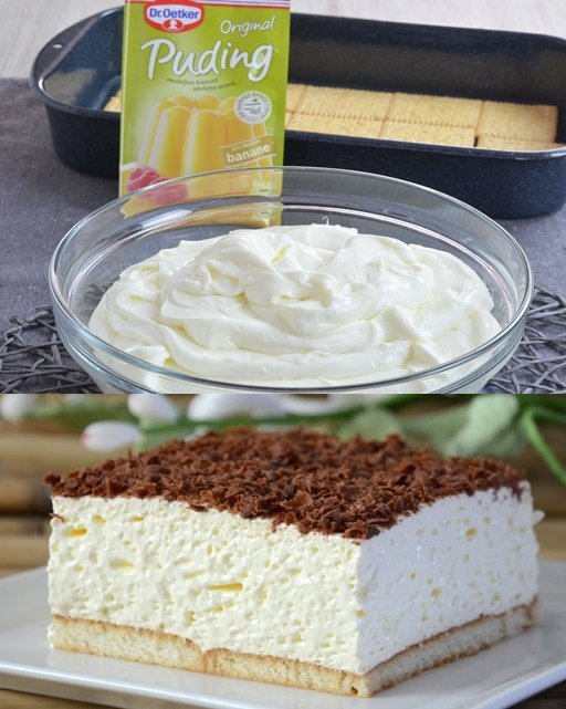 Počnite potapanjem keksa u mlijeko, a zatim ih organizirano slagati na podnožje tepsije, koje bi trebalo biti idealno veličine 21*36 cm. U prostranoj posudi pomiješajte puding, šlag, mlijeko, šećer i vanilin šećer. Mešajte sastojke oko pet minuta, pazeći da krema postigne zadivljujući nivo pahuljice.