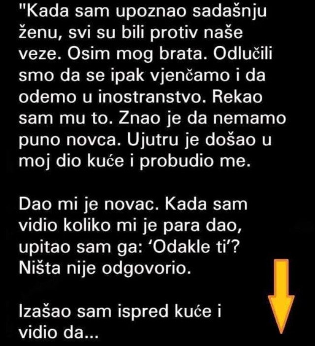“Kada sam upoznao sadašnju ženu, svi su bili protiv naše veze. Osim mog brata. Odlučili smo da se ipak vjenčamo i da odemo u inostranstvo. Rekao sam mu to. Znao je da nemamo puno novca. Ujutru je došao u moj dio kuće i probudio me.