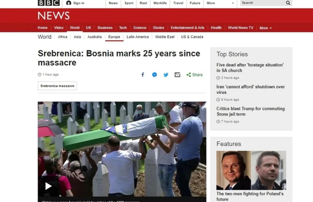 “Za vrijeme rata u Bosni, srpska vojska bila je uključena u operaciju etničkog čišćenja. Dana 11. jula 1995. godine jedinice bosanskih Srba na čelu s generalom Ratkom Mladićem zauzele su Srebrenicu…. Muškarci i dječaci odvojeni su od žena i odvedeni na streljanje. Hiljade njih je pobijeno, a njihova tijla su potom gurnuta u masovne grobnice. U manje od dvije sedmice srpske snage sistemski su ubile više od osam hiljada Bošnjaka”, napisali su iz BBC-a.