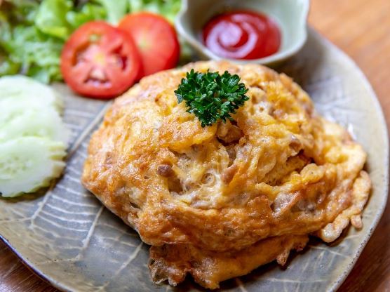 Poslužite:Ugasite vatru i poslužite tajlandski omlet na podlozi od tople kuhane riže sa sriracha umakom ili kečapom i uživajte!