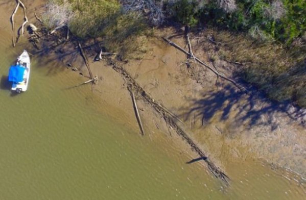 Pod debelim slojem blata i riječnog mulja nazire se kostur broda dugog 26 metara koji je izgorio ubrzo nakon nasukavanja u donjem toku delte Mobile-Tensaw.