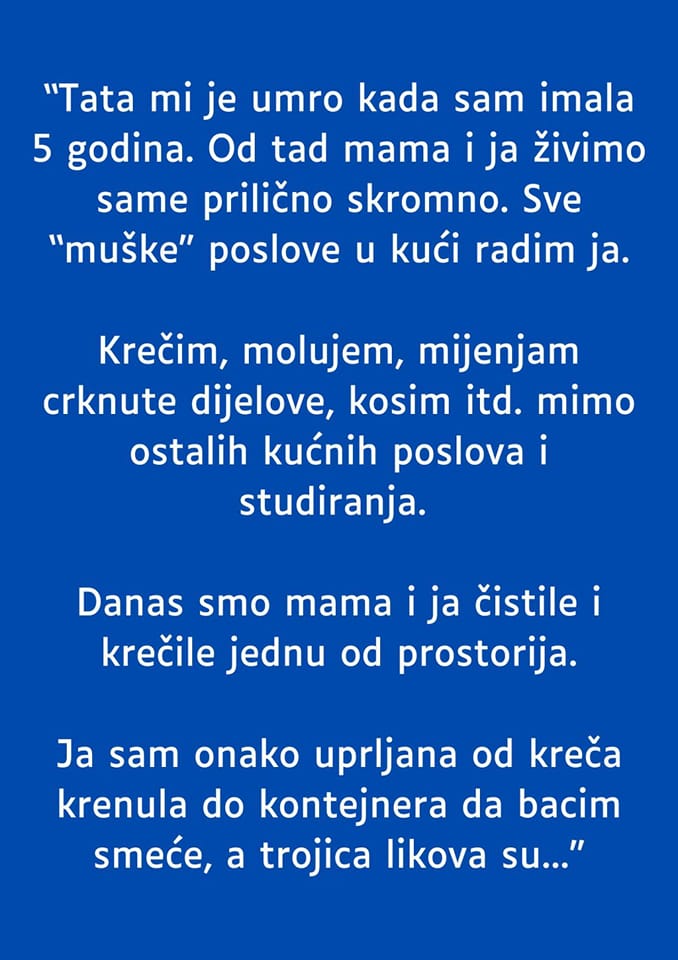“Tata mi je umro kada sam imala 5 godina. Od tad mama i ja živimo same prilično skromno. Sve “muške” poslove u kući radim ja.