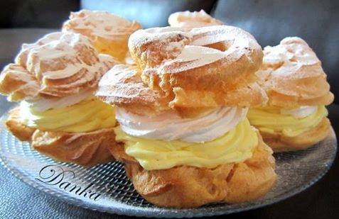 2,5 dl vode,125 g margarina,150 g brašna,1 kašika šećera,mrvica soli,4 kom jaja.Za kremu:1/2 l mlijeka,250 g šećera,2 kom žumanca,4 kašike uvrh pune gustina,2 kom vanil šećera,125 g margarina i još 3 dl slatke pavlake.