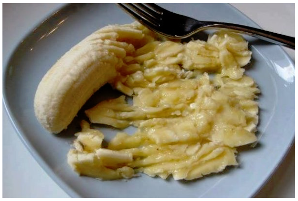 Priprema:Prvo oljuštite banane i izgnječite ih viljuškom ili kašikom. Bilo bi dobro da to uradite drvenim escajgom, jer će zbog metalnog potamniti.