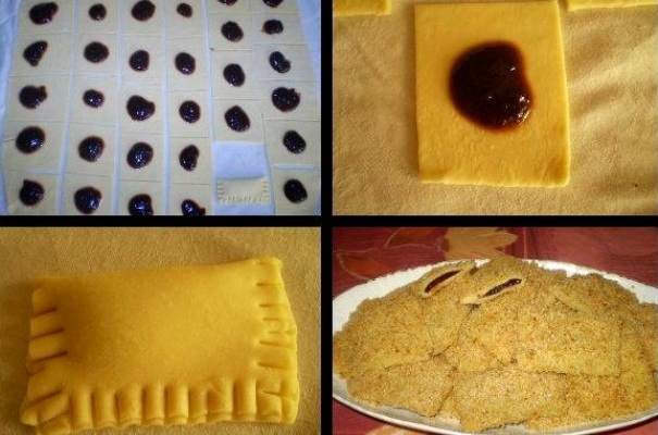 Kvadrate nadjenemo marmeladom i savijemo u pravokutnike ili trokute.