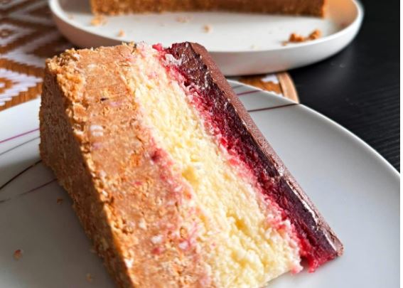 Vruće maline prelijte preko podloge od keksa i ostavite na sobnoj temperaturi da se malo ohlade, a onda stavite u hladnjak dok pripremate kremu od kokosa.