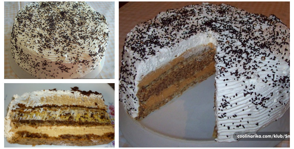 Ohladiti i dodati umućen margarin. Filovati: kora + fil II + kora + fil I + kora + fil II okolo staviti umućenu slatku pavlaku!
