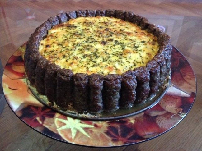 Ćevape složiti u krug u kalup. Ako su viši od posude u koju se slažu nožem iseći vrhove. Zatim na dno tepsije staviti polovinu smese od rendanog krompira, pa ćevape i one odsječene djeliće ćevapa. Staviti preostali krompir, ponovo ćevape i preliti sa prelivom. Staviti malo bibera, pokriti folijom i staviti u rernu na 180*C da se peče 60 minuta.