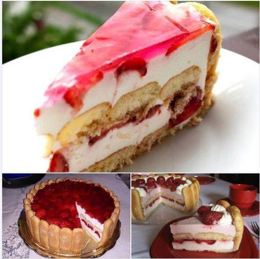 Zatim po kremi posložite red jagoda narezanih na ploške pa po jagodama namočene piškote.