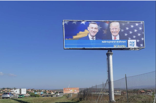 Demokratska partija Kosova, u okviru predizborne kampanje, promovišući bliske veze između svoga kandidata za premijera Kadrija Veselija i američkog predsednika Donalda Trampa, na bolbordima je istakla fotografiju susreta Veseljija i Trampa.