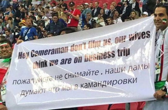 “Hej, kamermane, nemoj nas snimati, naše žene misle da smo na poslovnom putovanju”, piše na transparentu koji je grupa Iranaca držala na utakmici protiv Španije.