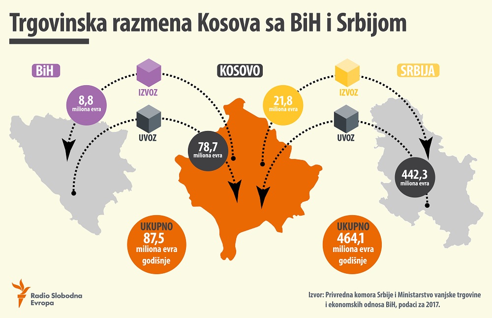 Odluka Vlade Kosova da uvede porez od deset odsto na robu iz Srbije i BiH, izazvala je oštre kritike u obe države. Brojke govore da od robne razmjene najmanje koristi ima Kosovo. Izvoz sa Kosova u Srbiju je dvadeset puta manji nego obratno. Tome doprinosi i činjenica da Srbija odbija da na svoje tržište plasira robu sa deklaracijom “Made in Kosovo” i dozvoli kompanijama sa Kosova ravnopravnu trku na tržištu.