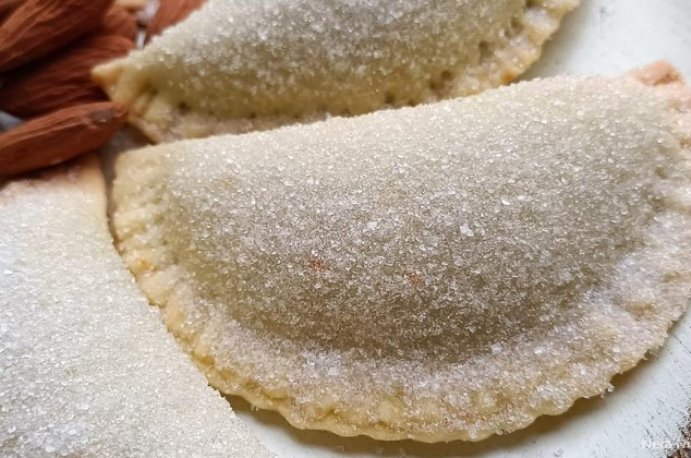 Razvaljajte i nadjenite.Odmoreno tijesto razvucite što tanje, da se kroz njega prozire. Režite tijesto na kružiće promjera 10 cm. U sredinu tijesta stavite pola žlice nadjeva te ga pažljivo zatvorite pritiščući rubove vilicom. Pecite na 170° oko 15-18 minuta dok im rubovi (čipkica ) ne počne tamniti.