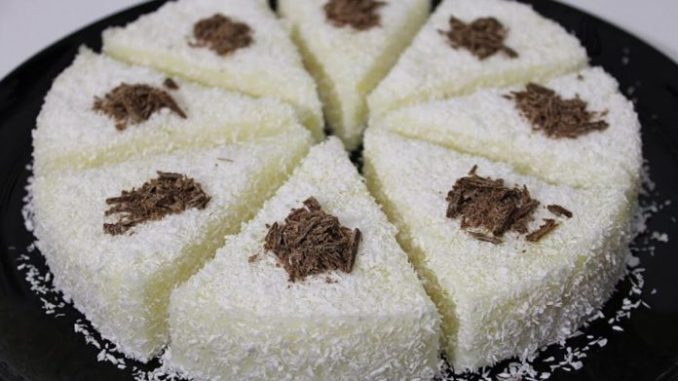 Rezati nožem umočenim u vodu. Sve premažite kokosom, naribajte čokoladu na vrhu i poslužite.