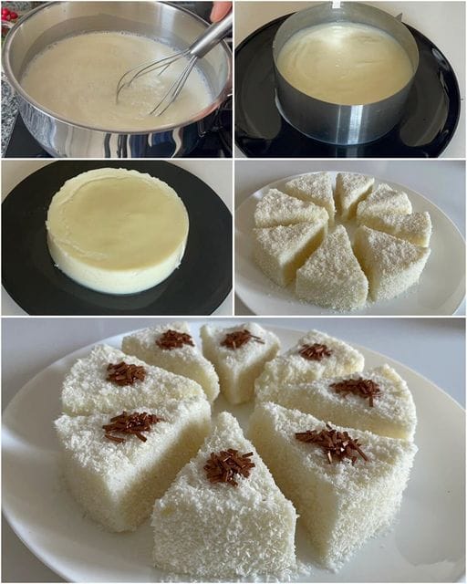 Nožem umočenim u vodu narežite sastojke. Nanesite obilan sloj kokosa da sve prekrije, pospite naribanu čokoladu po površini i poslužite.