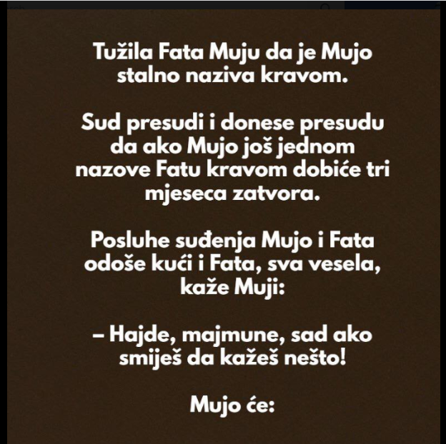 Sud presudi i donese presudu da ako Mujo još jednom nazove Fatu kravom dobiće tri mjeseca zatvora.