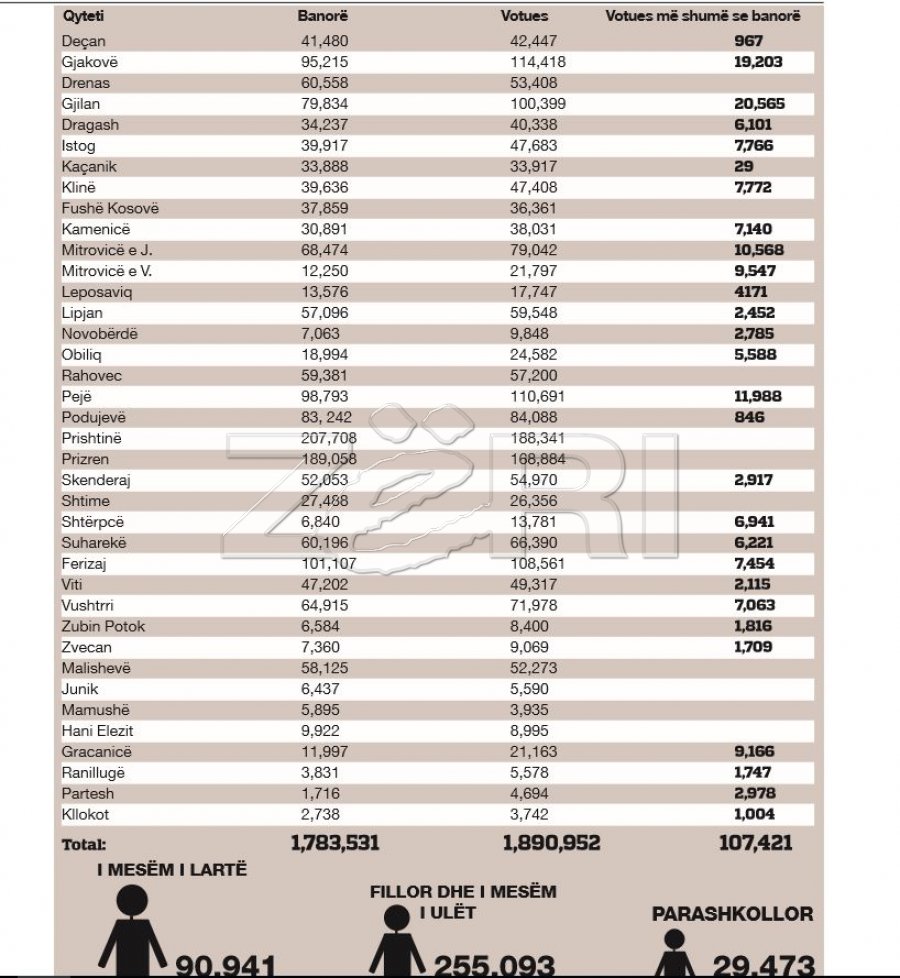 List “Zëri” napravio je poređenje između CIK-ove liste glasača i broja stanovnika u opštinama, koji se pojavljuje u Agenciji za statistiku Kosova, iz čega se jasno vidi da 29 kosovskih opština ima više glasača, nego stanovnika. Gnjilane ima 20.000 više glasača nego stanovnika, dok Gračanica ima za polovinu više glasača, nego stanovnika.