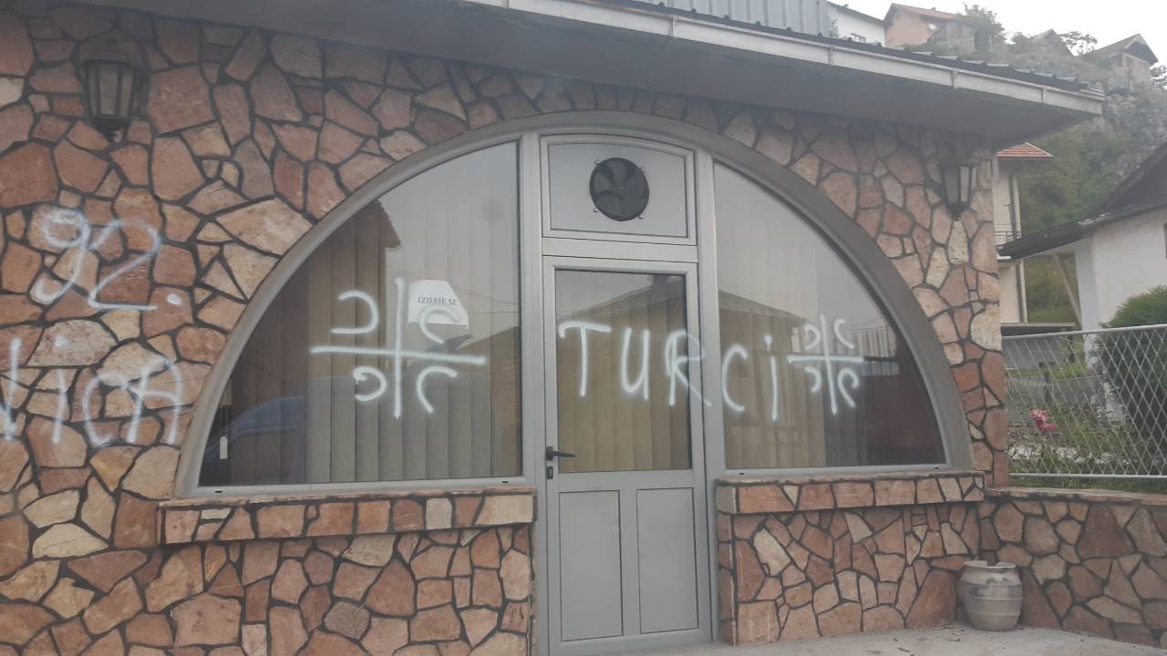 Kako se vidi na fotografiji, na jednom objektu je sprejem napisano “Turci” pored čega je nacrtan i simbol “4C” na ćirilici.