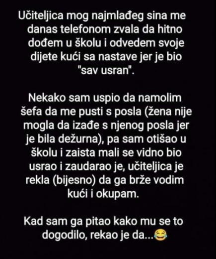Učiteljica mog najmlađeg sina me je danas telefonom zvala da hitno dođem u školu i odvedem svoje dijete kući sa nastave jer je bio “sav usran”.Nekako sam uspio da namolim šefa da me pusti s posla (žena nije mogla da izađe s njenog posla jer je bila dežurna), pa sam otišao u školu i zaista mali se vidno bio usrao i zaudarao je, učiteljica je rekla (bijesno) da ga brže vodim kući i okupam.