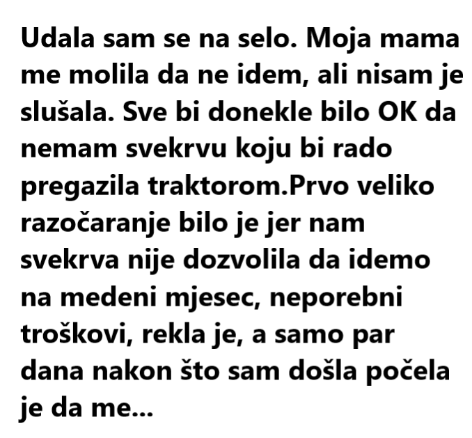 Udala sam se na selo. Moja mama me molila da ne idem, ali nisam je slušala. Sve bi donekle bilo OK da nemam svekrvu koju bi rado pregazila traktorom. Pvo veliko razočaranje bilo je jer nam svekrva nije dozvolila da idemo na medeni mjesec, neporebni troškovi, rekla je, a samo par dana nakon što sam došla počela je da me maltretira i psihički i fizički.