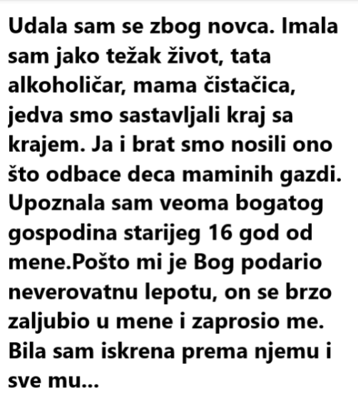 Udala sam se zbog novca. Imala sam jako težak život, tata alkoholičar, mama čistačica, jedva smo sastavljali kraj sa krajem. Ja i brat smo nosili ono što odbace deca maminih gazdi. Upoznala sam veoma bogatog gospodina starijeg 16 god od mene.Pošto mi je Bog podario neverovatnu lepotu, on se brzo zaljubio u mene i zaprosio me. Bila sam iskrena prema njemu i sve mu ispričala ali je on prihvatio to da ga ja ne volim i venčali smo se.