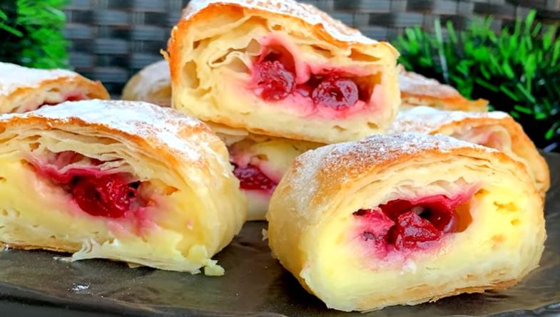 Skuhati puding po uputi na vrećici.Na pripremljeno tijesto razmazati polovicu pudinga pa preko njega rasporediti polovicu višanja. Rubne krajeve prebaciti prema unutra pa uz pomoć papira na kojem se nalazi lisnata kora zarolati roladu.Postupak ponoviti i sa drugom korom.Rolade izbockati vilicom na više mjesta, premazati razmućenim jajetom pa peći u pećnici na 180ºC 35 minuta.Rashladiti, rezati na manje komade i poslužiti.P.S. Rolada se lakše reže ako se malo prohladi jer će u protivnom puding curiti van 😉