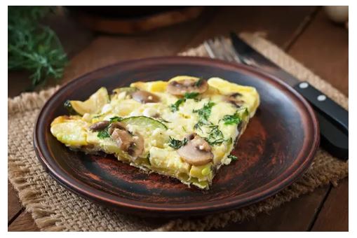 Gljive očistite četkicom i narežite na ploške. Poriluk narežite na rezance. U tavi rastopite maslac i pustite neka se jako zagrije. Ubacite poriluk pa gljive i zapecite ih na jakoj vatri, da potamne i lagano se karameliziraju. U posudi sa strane istucite jaja pjenasto, sa soli i paprom. Smjesi dodajte i parmezan. U tavu ubacite i kockice slanine. Čim se rastopi izlijte smjesu od jaja. Smanjite vatru do srednje jačine i pecite samo s jedne strane bez miješanja, dok korica ne postane rumena i hrskava, a sredina ostane još malo kremasta.