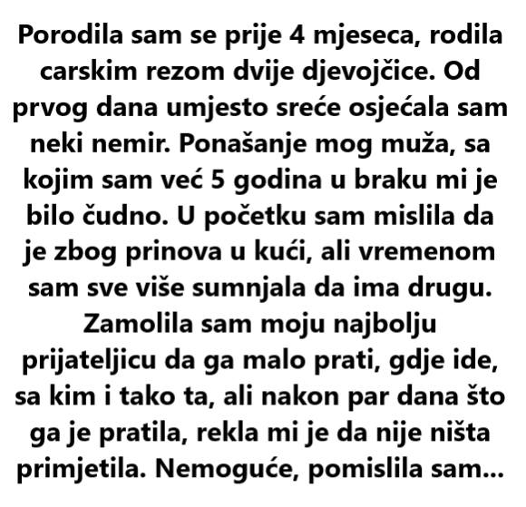 Porodila sam se prije 4 mjeseca, rodila carskim rezom dvije djevojčice. Od prvog dana umjesto sreće osjećala sam neki nemir. Ponašanje mog muža, sa kojim sam već 5 godina u braku mi je bilo čudno. U početku sam mislila da je zbog prinova u kući, ali vremenom sam sve više sumnjala da ima drugu. Zamolila sam moju najbolju prijateljicu da ga malo prati, gdje ide, sa kim i tako ta, ali nakon par dana što ga je pratila, rekla mi je da nije ništa primjetila. Nemoguće, pomislila sam, jer prosto sam osjećala.