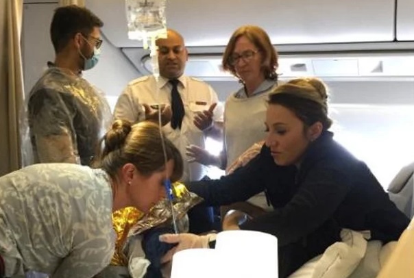 Nakon što je osoblje aviona tražilo ljekara Hemal je shvatio da pomoć treba 41-godišnjoj Toyin Ogundipe koja je dobila porođajne trudove.