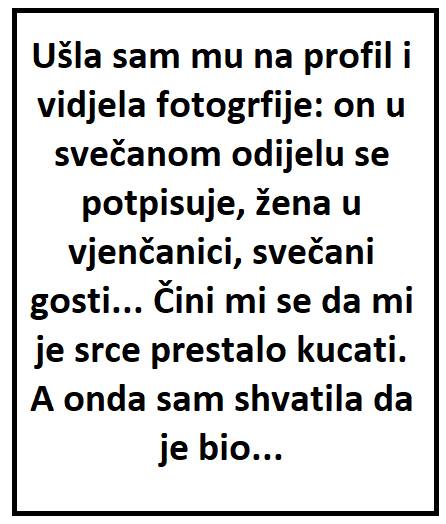 Ušla sam mu na profil i vidjela fotogrfije: on u svečanom odijelu se potpisuje, žena u vjenčanici, svečani gosti… Čini mi se da mi je srce prestalo kucati. A onda sam shvatila da je bio kum na vjenčanju. Isplakala sam se kao kiša od same pomisli na njegovu svadbu.