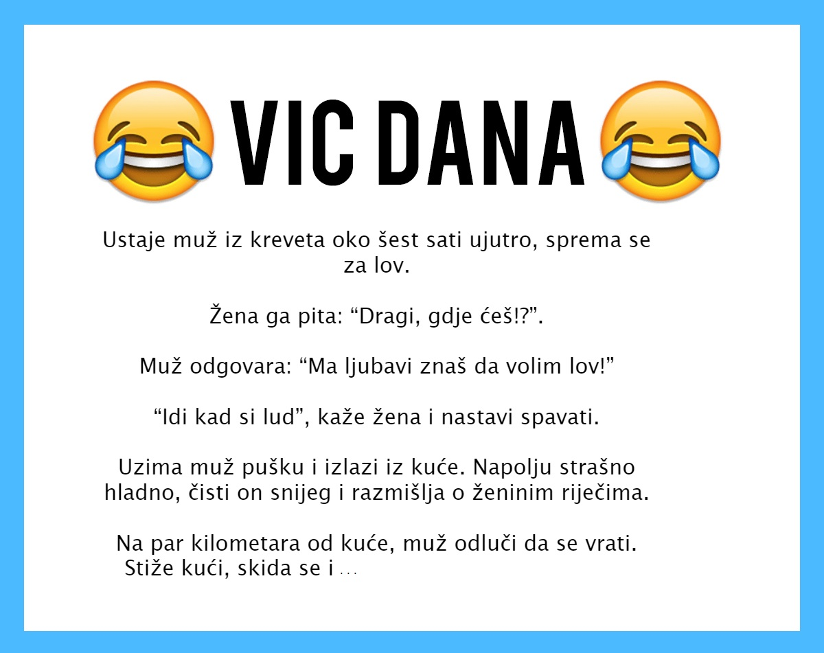 Ustaje muž iz kreveta oko šest sati ujutro, sprema se za lov.Žena ga pita: “Dragi, gdje ćeš!?”.Muž odgovara: “Ma ljubavi znaš da volim lov!”“Idi kad si lud”, kaže žena i nastavi spavati.Uzima muž pušku i izlazi iz kuće.