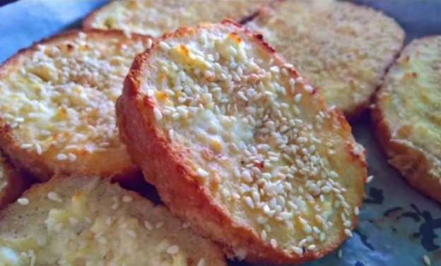 2 jajeta (ako su sitnija moze i 3 jajeta),100 ml mleka,50 ml ulja,100 ml jogurta,250 g sira,stari hleb (11-15 parčića hleba),susam za posipanje