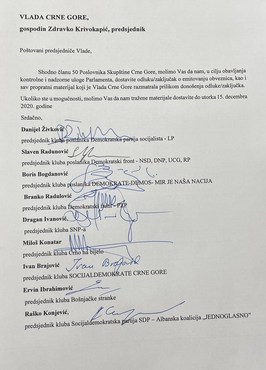 Predsjednici poslaničkih klubova u Skupštini Crne Gore obratili su se premijeru Zdravku Krivokapiću sa zahtjevom da im se, radi obavljanja kontrolne i nadzorne uloge Skupštine, dostavi odluka o emitovanju obveznica, kao i propratni materijal koji je razmatran prilikom donošenja odluke.